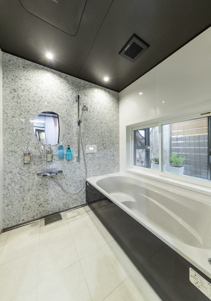 大きな窓から坪庭を眺めることができ、ゆったりと寛げるバスタイムを作ります。