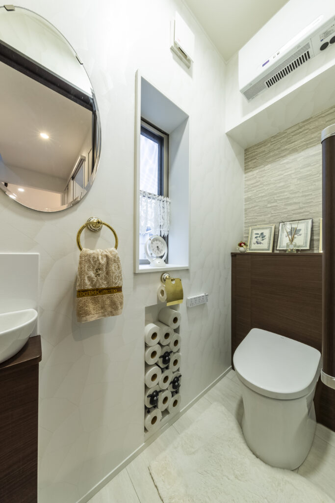 他と同様ホワイトを基調とした空間ですが、木目の背面パネルと手洗いボール下部パネルがアクセントになっています。