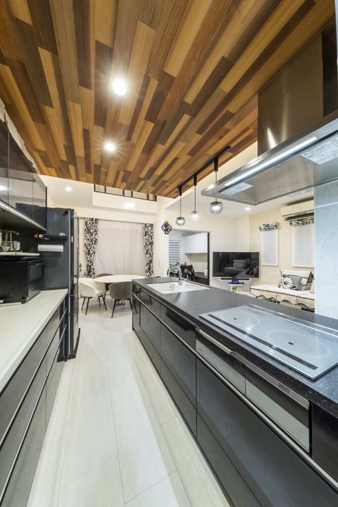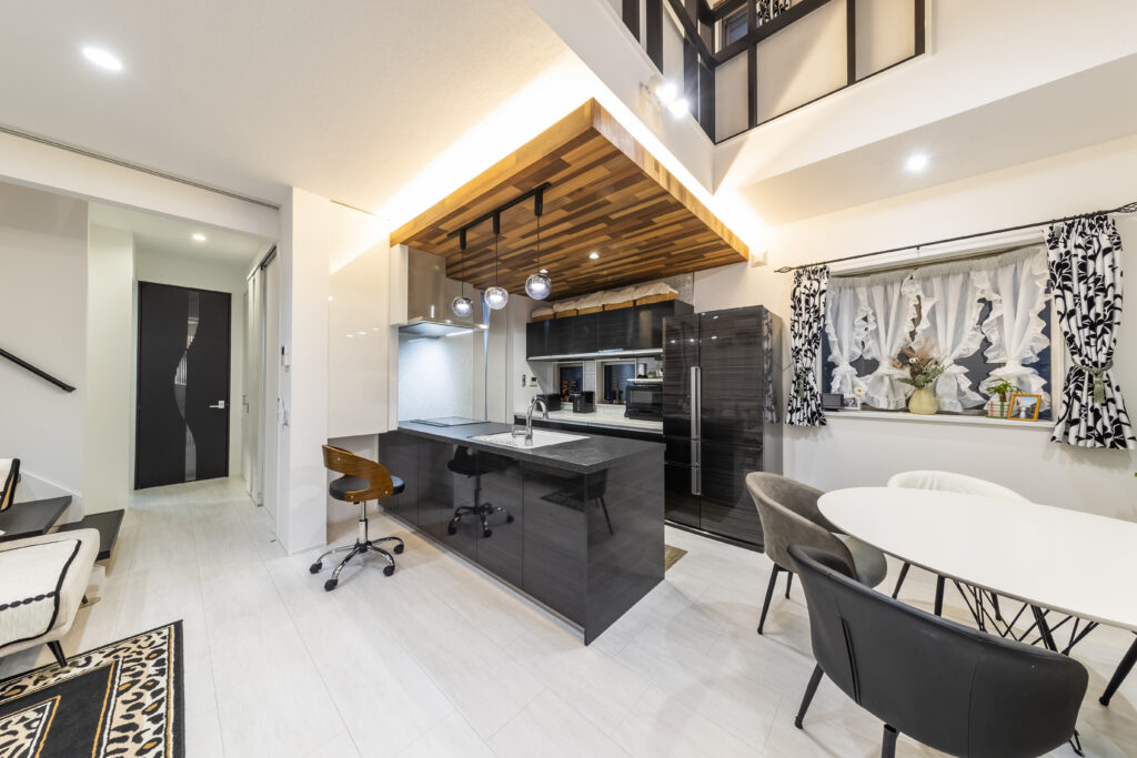 ホワイトを基調とした空間に、キッチンの部分のみ木目調の下がり天井を設えています。